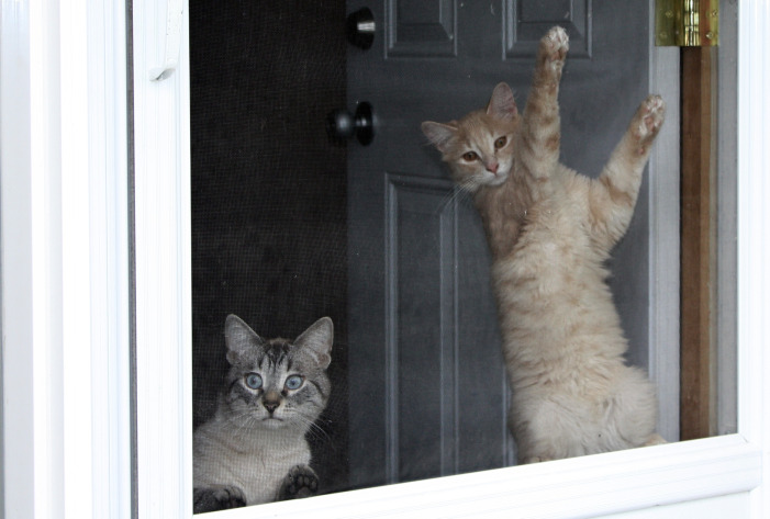 1. Those are the names my brother came up with–I emailed him the picture asking for a quick quip–he’s funny like that. I was at the neighbor’s the other day when I noticed she had a cat attached to her screen–so I went home and got my camera, and when I got back there was another cat there. I only had time for one quick snap and then they were gone. But, I had no idea this other cat had this ‘paranoia’ thing going on–I was only hoping the picture turned out so I could crop the ‘clinging’ one.