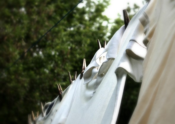 This morning, as I was hanging my laundry on the line in descending order of weight and size, I took my time to drape the last few articles—with stains—facing the sun. Nothing can disintegrate mustard spots and fade the vilest blotches of blood like a June morning’s piercing rays. Last week I hung a white tunic up with a mango mark that hadn’t come out in the wash, and hours later I reeled it back in without spot or wrinkle. Okay, it still had a few wrinkles­—we’re at the mercy of the wind for that—but the yellow fleck had forever fled from the sun’s penetrating gaze.